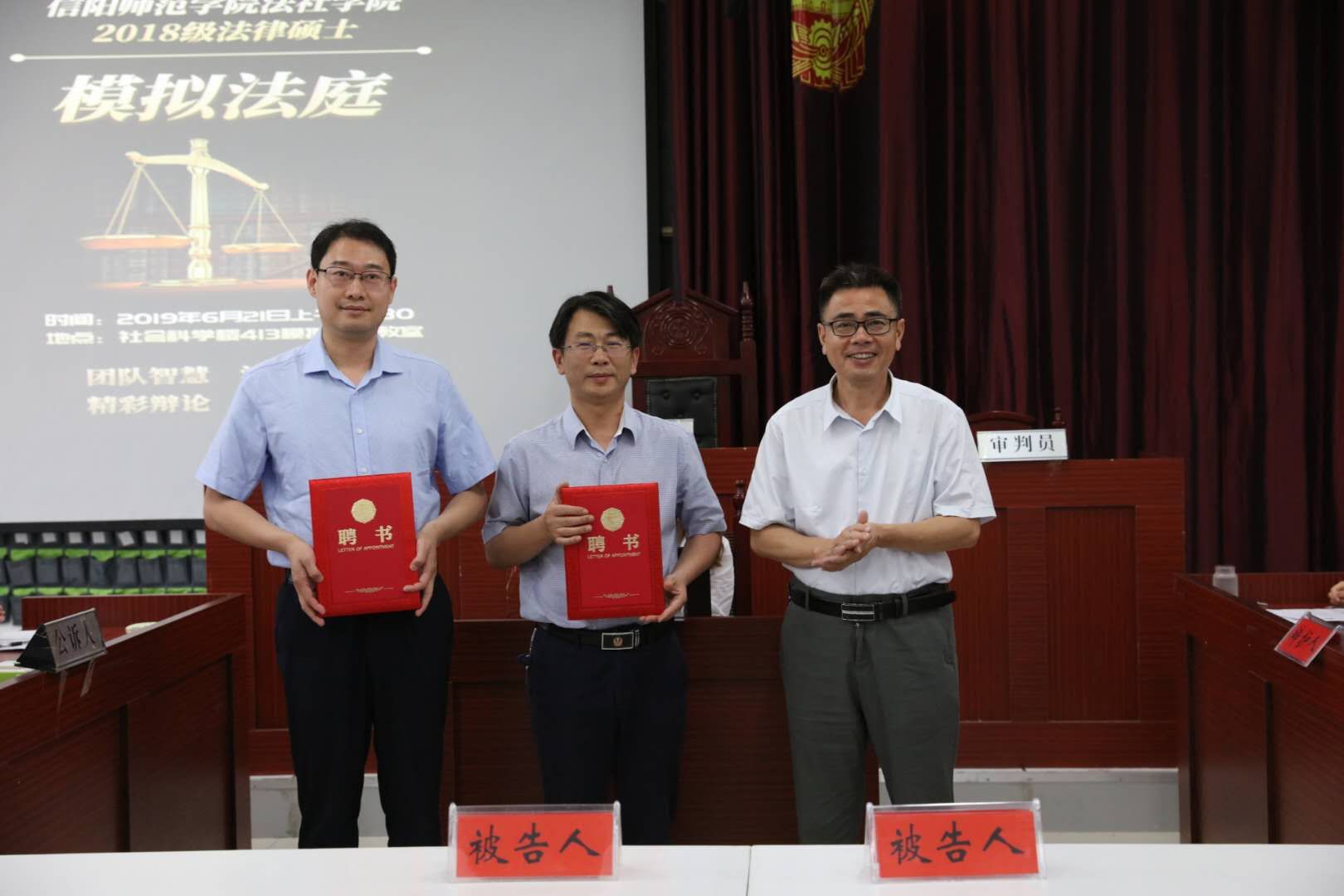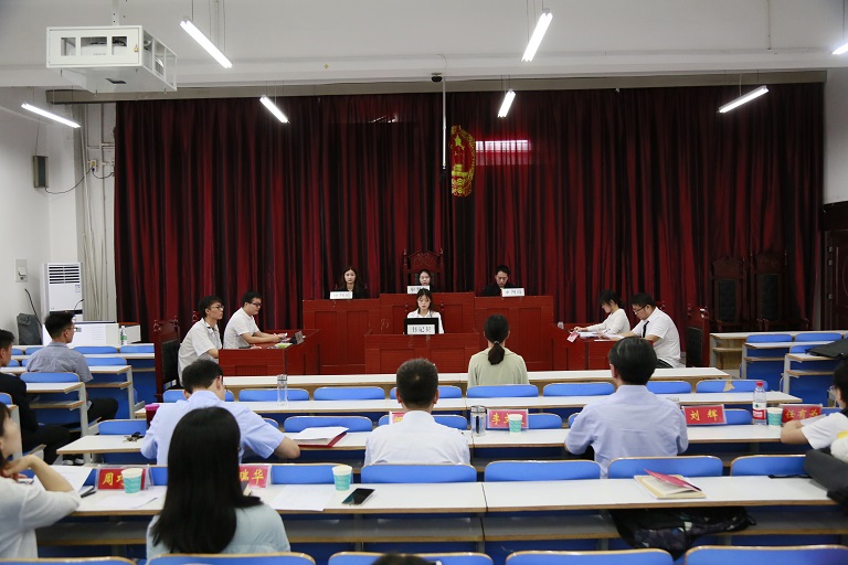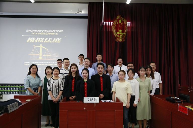 2019年6月21日上午,法社学院2018级法律硕士模拟法庭在社科楼413模拟法庭教室开庭。本次模拟法庭活动,由法社学院实践教学主任张宇博士主持,信阳市中级人民法院刑一庭副庭长刘辉法官、民一庭副庭长郑鹏飞法官、校学科办主任何安明教授、研究生培养管理科周巧云老师、院长李文发教授、党委委员古瑞华副教授、院长助理李小侠副教授、硕士生导师代表陈东果副教授旁听庭审并担任点评嘉宾。2017级全体法学本科生观摩了本次模拟庭审。