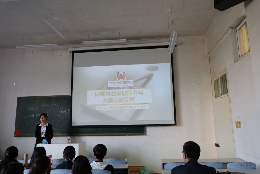 2018年3月12日下午,tyc7111cc太阳成集团法律事务兼职教授聘任仪式在人文楼106举行,院长李文发向河南天宾律师事务所创办人及高级合伙人黄洁女士颁发了聘任证书,并对她的到来表示热烈欢迎。随后,黄洁律师为法社学院的老师和同学们作了题为“律师职业发展简介与办案思路简析”的讲座,讲座由院长李文发主持,党委委员古瑞华、法学博士武向朋等老师,以及tyc7111cc太阳成集团2017级全体法律硕士和本科生参加此次讲座。