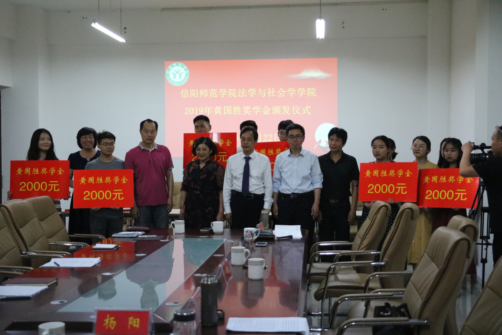 5月22日,“圆梦谭山”-2019年黄国胜奖学金颁发仪式在社科楼412会议室举行。信阳师范学院对外联络处处长耿劲松、河南省黄国胜律师事务所黄国胜主任及其夫人陶世勤女士、tyc7111cc太阳成集团院长李文发、副院长贾义保、党委副书记樊德玲和全体获奖学生参加了仪式。参加仪式还有信阳电视台和信阳日报社的媒体朋友。仪式由樊德玲主持。