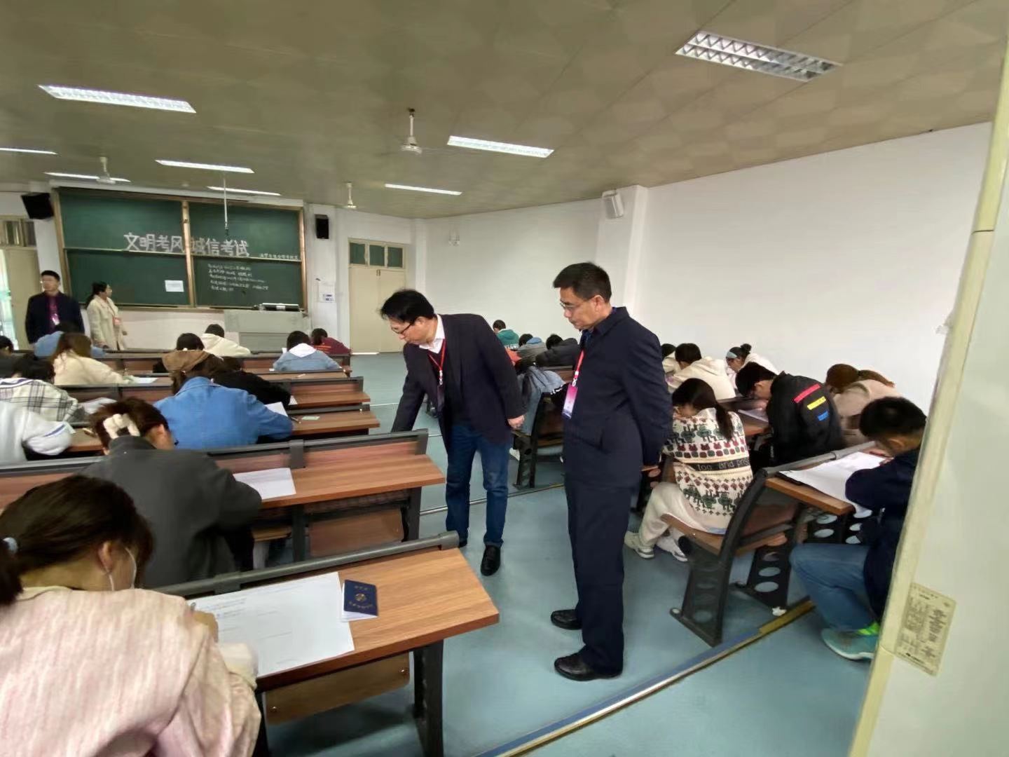 教学办在学院微信群中发布考试安排信息,提前一天通知监老师,要求监考老师必须佩戴学院监考证,在开考前30分钟领取试卷,做好考场编排,保证监考效果。考试期间,学院班子成员全员参与巡考工作,对考场秩序、考场编排、考场监考进行了详细检查。院长李文发、党委书记王文华对监考教师各司其职、严肃认真的工作作风充分肯定,对同学们态度端正、仔细作答、严格遵守考试纪律提出表扬。