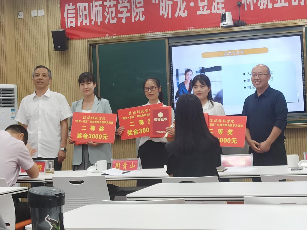 时间:2021-06-23 09:43 来源: 作者: 阅读: 次6月22日,信阳师范学院“昕龙•豆涯”杯就业创业教学大奖赛决赛在逸夫楼B座201顺利举行。教务处领导李文田、教务处教育教学评估中心副主任周青山、招生就业处副处长刘百超、数学与统计学院书记王娟、昕龙和豆涯赞助机构的负责人出席本次决赛活动现场并颁奖。本次大赛通过初赛、复赛、决赛三个阶段,我院王艳丽老师顺利通过各个阶段,最终荣获本次大赛的二等奖。