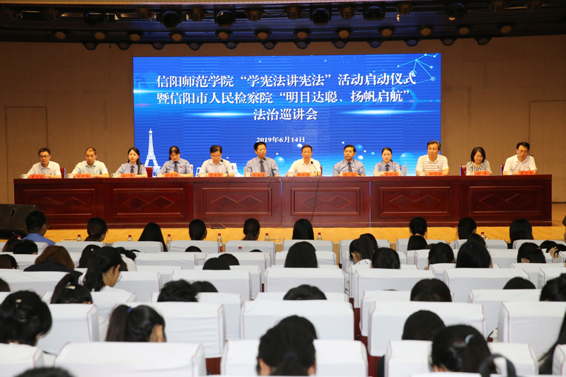 时间:2019-06-17 23:47 来源: 作者:admin 阅读: 次6月14日,我校2019年“学宪法讲宪法”活动启动仪式暨信阳市人民检察院“明目达聪、扬帆启航”法治巡讲会在理科楼报告厅举行。信阳市人民检察院党组书记、检察长郭国谦,专职检委会委员宋松,第九检察部主任彭圣侠;我校党委副书记郜火星,党委委员、宣传部长丁少锋,党委保卫部部长叶先锋,团委书记王建旭,党委学工部副部长赵晨,tyc7111cc太阳成集团党委书记王文华、院长李文发出席启动仪式。河南省人民检察院宣讲员、商城县人民检察院第五检察部主任彭秋思,信阳市人民检察院宣讲员、平桥区人民检察院第五检察部检察官柴慧作“明目达聪、扬帆启航”法治主题宣讲报告。信阳市人民检察院第九检察部全体干警和我校近500名大学生代表参加启动仪式并聆听了宣讲报告。
