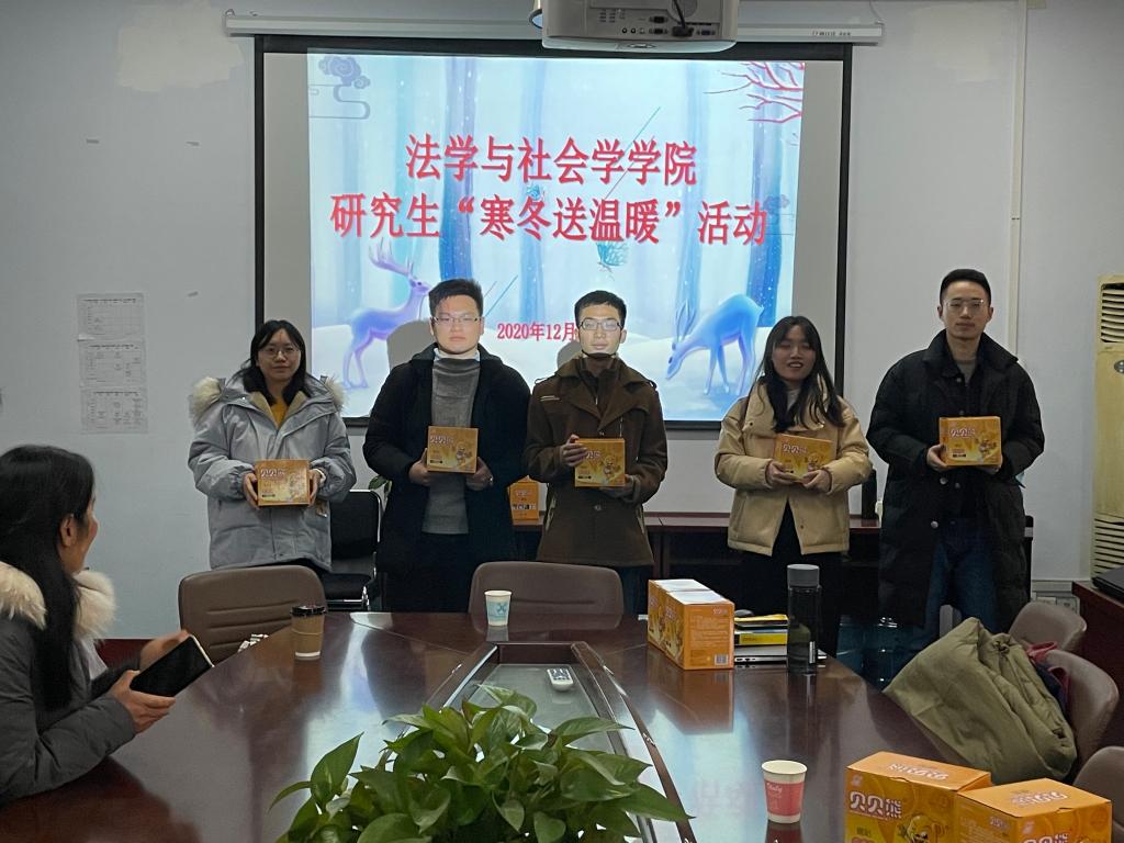 时间:2020-12-31 16:02 来源: 作者:衡连杰 阅读: 次12月29日下午,tyc7111cc太阳成集团研究生“寒冬送温暖”活动在教八楼研究生会举行,党委委员古瑞华教授出席并主持活动,刘文君博士以及全体法律硕士参与了此次活动。