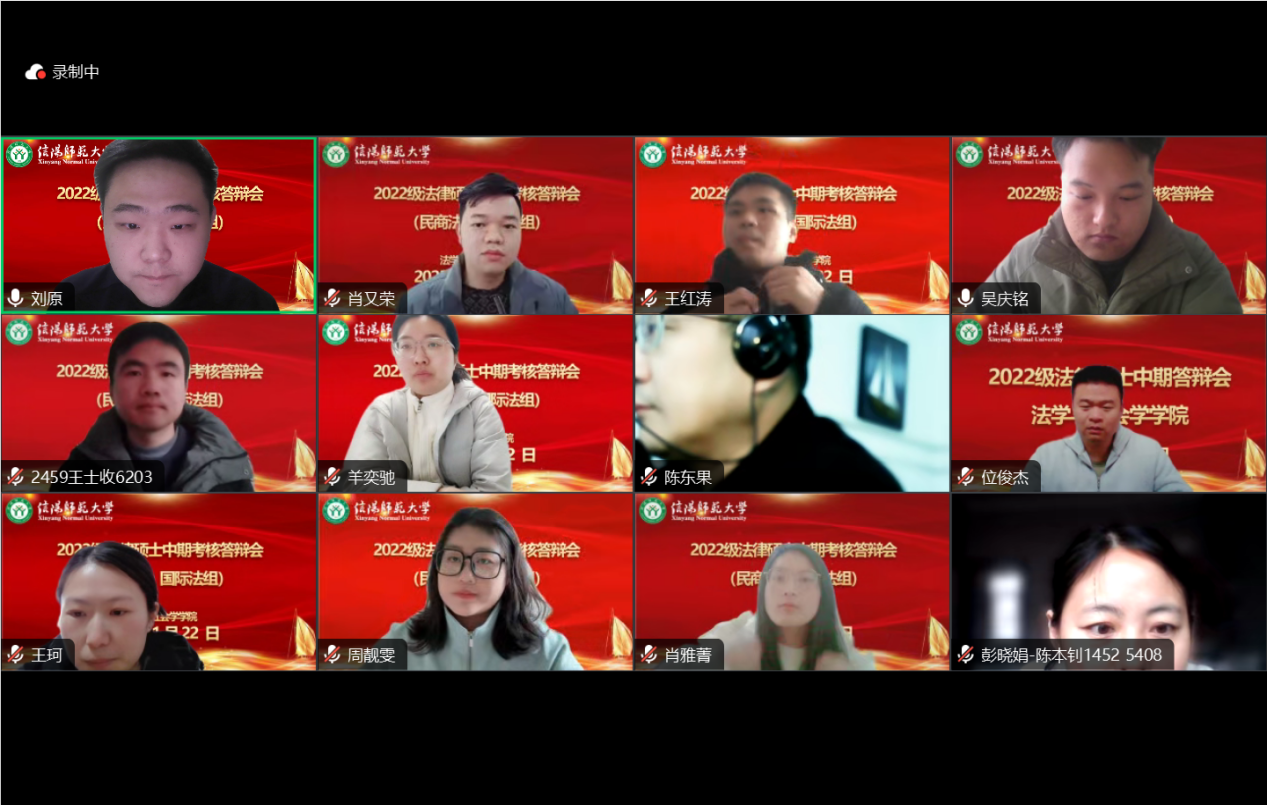 时间:2025-01-23 15:53 来源: 作者: 阅读: 次1月20-22日,我院于腾讯会议顺利举行2022级法律硕士线上中期答辩会。古瑞华、陈东果、朱茂磊分别担任答辩会员会主席,武向朋、李伶俐、张宇、彭晓娟、李昱晓、刘文君担任答辩委员会委员,我院2022级32位法律硕士参加了本次中期答辩。