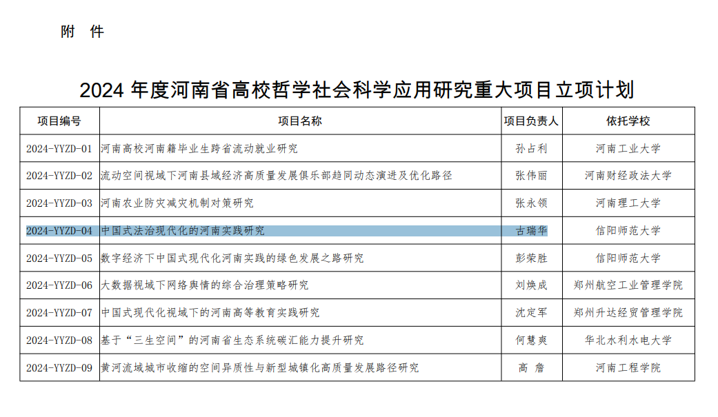 近日,河南省教育厅下达《2024年度河南省高等学校哲学社会科学应用研究重大项目立项计划》(教社语〔2023〕296号),我院副院长古瑞华教授主持申报的《中国式法治现代化的河南实践研究》获批立项,实现了我院在该类项目上的新突破。