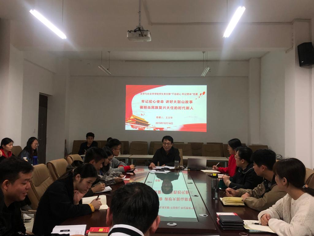 10月16日,党委书记王文华在社科楼412会议室为学生支部上了“牢记初心使命 讲好大别山故事 做担当民族复兴大任的时代新人”主题党课。参加人员为我院研究生、本科生三个学生支部全体党员,入党积极分子及获得国家奖学金、国家励志奖学金品学兼优的同学。王文华在授课中结合习近平总书记在河南考察调研时的重要讲话精神,提出要从大别山革命的历史及精神、大别山精神对我们的启示两方面进行学习。一是从大别山历史精神中学习到以中国共产党人为代表的大别山革命群体始终坚守初心,在革命紧要关头不畏惧、不退缩,团结一心,牺牲自己为全局胜利创造条件表现出的高度奉献精神。二是从大别山精神的启示中学习到在传承红色基因、讲好大别山故事中巩固和升华理想信念,争做担当民族复兴大任的时代新人。