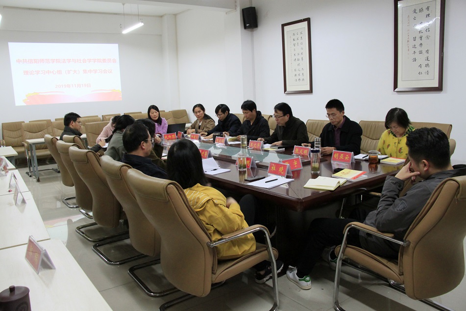 时间:2019-11-20 10:11 来源: 作者:袁艳红 阅读: 次11月19日,法社学院党委召开党委理论学习中心组(扩大)会议 ,传达学习贯彻党的十九届四中全会精神,贯彻落实学校党委关于贯彻落实十九届四中全会精神的部署。法社学院班子成员、党支部书记、教学组织负责人、科级干部参加学习。学院党委书记王文华主持会议并讲话。