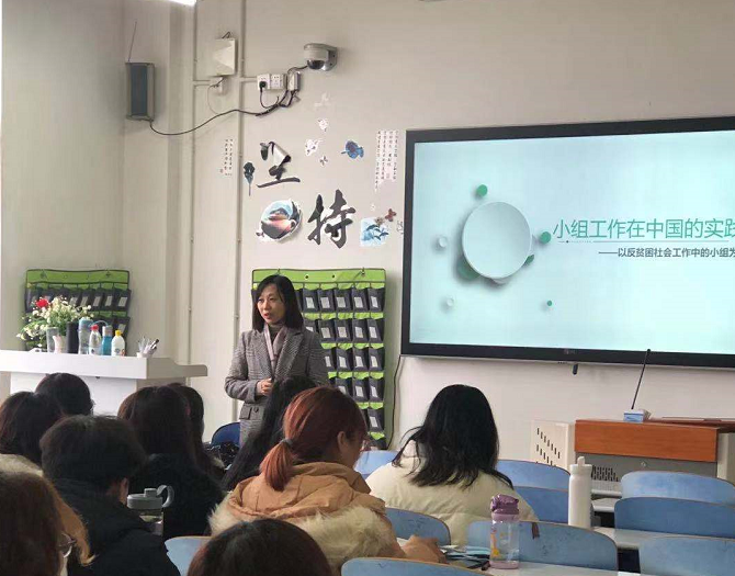 观摩课上蔡瑾老师以反贫困社会工作小组为例对小组工作在中国的实践进行深入浅出的讲解。蔡老师介绍了我国贫困救助工作和反贫困社会工作的开展情况, 通过“云南平寨的少数民族扶贫项目”和“云南小额信贷扶贫计划”两个典型案例,重点讲述了反贫困社会工作的实践路径。