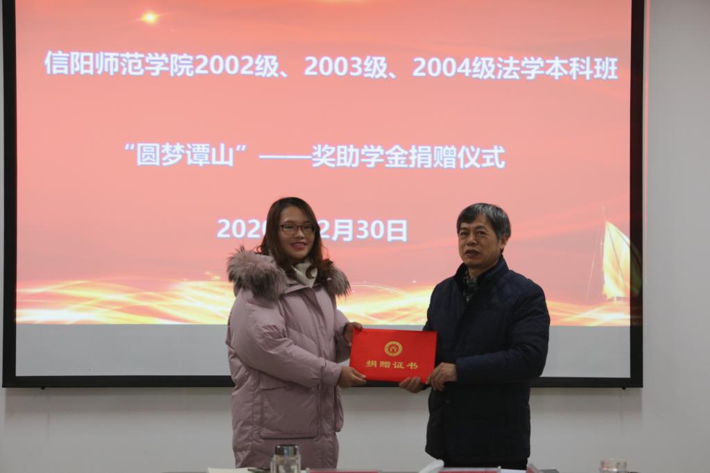 时间:2020-12-31 15:58 来源: 作者:古瑞华 阅读: 次2020初雪悄然而至,法社校友“圆梦谭山”行动温暖开启。12月30日,法学专业校友“圆梦谭山”奖助学金捐赠仪式在法社学院会议室举行。校长李俊出席活动。2002级法学班校友、中原银行信阳分行公司类清收中心总经理卢建广,2003级法学2班校友、潢川县宣传部文明城市创建室主任王瑛琳、信阳市人大内司工委副科长雷莉,2004级法学1班校友、平桥区自然资源局一级科员董正俊代表各班校友来校捐赠。对外联络处、法社学院负责同志以及法社学院各班集体班长、团支书参加捐赠仪式。法社学院党委书记王文华主持仪式。