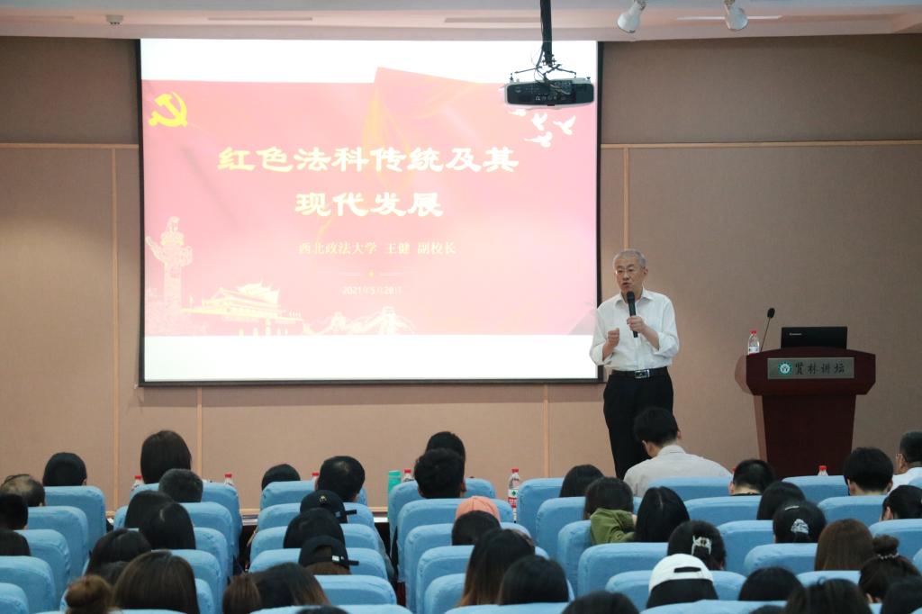 时间:2021-05-29 11:01 来源: 作者:刘文君 叶苏煜 阅读: 次5月28日,西北政法大学副校长王健教授在贤林讲坛作题为“红色法科传统及其现代发展”学术讲座。法社学院法学专业教师、法律硕士研究生、法学专业本科生近200人聆听报告。法社学院院长李文发主持讲座。
