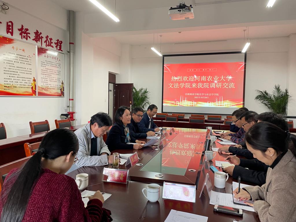 古瑞华对河南农业大学文法学院来访表示欢迎,介绍了我院的发展历程、学科布局、学位点建设和近年来取得的成绩。她指出法律硕士专项评估是学位点建设的重要着力点,我院立足“以评促建、以评促改、评建结合”的指导思想,圆满完成评估工作。她表示,河南农大文法学院在社工专硕点建设上早于我院,拥有丰富的学位点建设经验,今年是“十四五”开局之年,希望两院能够借此契机,互学互鉴,共同进步。