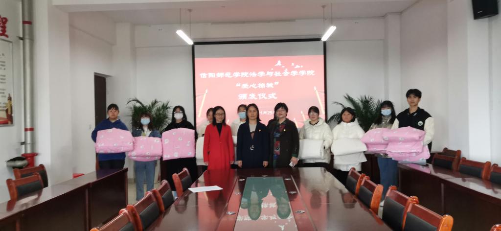 时间:2021-11-25 17:00 来源: 作者: 阅读: 次寒冬将至,我院领导老师心系学生,为家庭经济困难同学准备了部分过冬物资。11月25日,我院在社科楼412举行了“寒冬送温暖”爱心棉被发放仪式。副院长古瑞华、党委副书记李莉、资助专员王艳丽参加了颁发仪式。