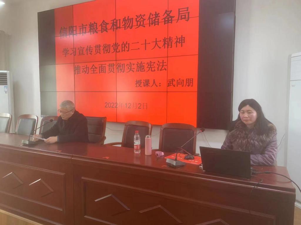 12月2日下午,我院副院长武向朋受邀在信阳市粮食和物资储备局五楼会议室作题为《依法行政与法治政府建设》的报告,信阳市粮食和物资储备局机关干部、质检站、军粮供应中心全体人员和其他局直单位主要负责人参加。
