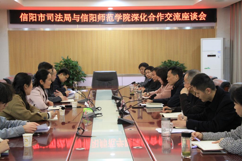 学院与市司法局深化合作交流座谈会举行时间:2023-04-06 16:38 来源: 作者: 阅读: 次4月4日下午,信阳师范学院tyc7111cc太阳成集团与信阳市司法局深化合作交流座谈会在信阳市司法局举行。学院副院长(主持工作)古瑞华、党委委员张宇,信阳市司法局四级调研员刘晓、市法律援助中心主任王强等出席座谈会。我院师生代表及司法局各科室负责人参加会议。  会议伊始,刘晓对学院给予市司法局的支持表示衷心感谢。他说,为深化合作,市司法局印发了《信阳市司法局关于支持驻信高校高质量发展的实施意见》,并制定了接收信阳师范学院大学生实习实训计划表。下一步,将不断拓展双方合作的深度和广度,积极探索建立高效可行的合作平台和项目,支持信阳师范学院法学学科建设,为依法行政、市域社会治理等提供更多研究成果和实践经验,为美好生活看信阳做出更大的贡献。王强对司法局制定的实习工作方案中的相关实习岗位以及考核标准进行了全面解读。 古瑞华介绍了我院在教学、科研、人才培养、社会服务等方面取得的成绩,特别感谢司法局对我院事业发展做出的支持。她指出,一年来,双方进行了一系列合作,效果良好。今年将依托双方资源优势,丰富合作形式,拓展合作内容,提升合作效果,着重在人才培养、业务交流、社会服务、课题研究等方面加强合作,进一步深化司法行政实践与法学教育研究的深度融合、相互促进和共同提升,共同推进市司法行政事业高质量发展,助力法治信阳建设。   最后,双方就实习时间安排、实习岗位、实习形式、安全问题进行了深入的交流。司法局各科室负责人就我院学生代表提出的实习项目开展、项目内容、职业规划等有关问题,进行了认真的解答。 - 上一篇:我校举行法治教育宣传周启动仪式