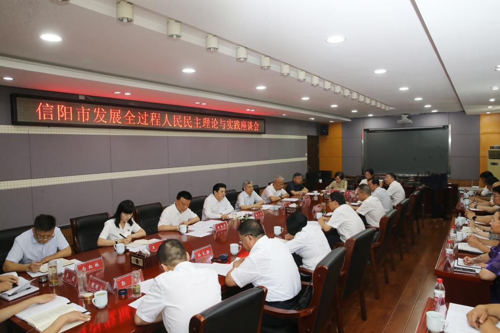 在信阳市发展全过程人民民主理论与实践座谈会上,六位代表从人大代表履职尽责、全过程人民民主基层实践、示范点建设等角度做了经验交流。tyc7111cc太阳成集团相关负责人分别从研究保障、研究方向、研究进度、成果凝练等角度做了工作交流。