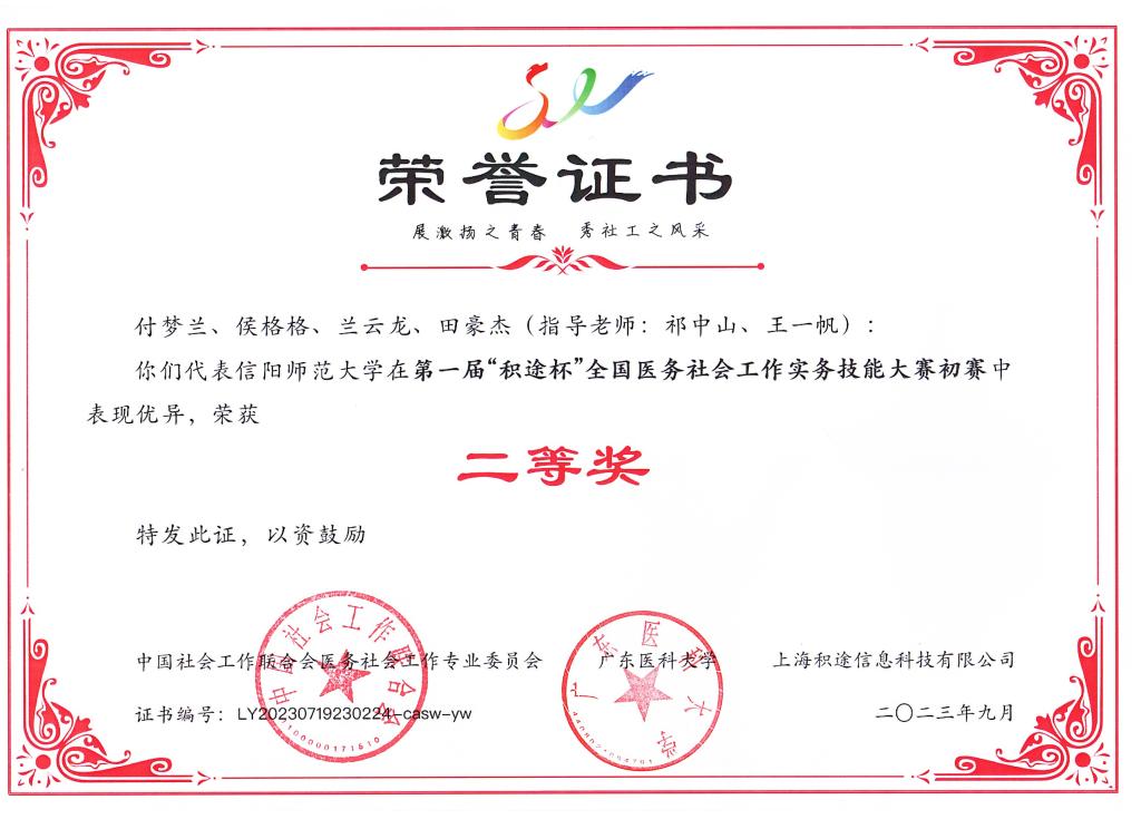 时间:2023-09-22 16:50 来源: 作者: 阅读: 次9月17日,第一届“积途杯”全国医务社会工作实务技能大赛开赛。大赛由中国社会工作联合会医务社会工作专业委员会、广东医科大学主办,广东医科大学人文与管理学院承办,上海积途信息技术有限公司提供技术支持,中国人民大学、复旦大学、山东大学、南京理工大学等208支高校及医务机构的队伍报名参加。法学与社会学学院“搬砖小分队”团队在大赛中荣获二等奖佳绩。
