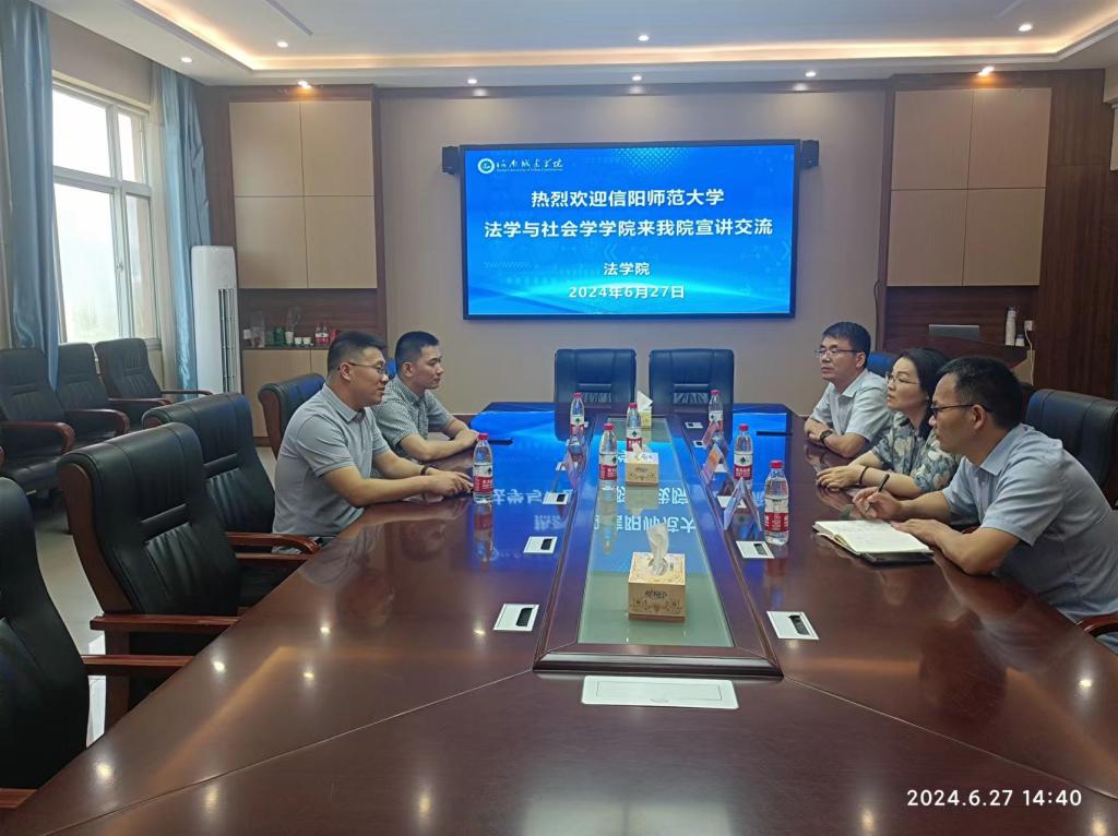 时间:2024-06-30 11:12 来源: 作者: 阅读: 次6月27日下午,tyc7111cc太阳成集团法学系主任朱茂磊副教授、团委书记费泽丹老师一行3人赴河南城建学院法学院开展研究生招生宣传。河南城建学院法学院副书记吴锦展,副院长马东丽、张强出席有关活动。