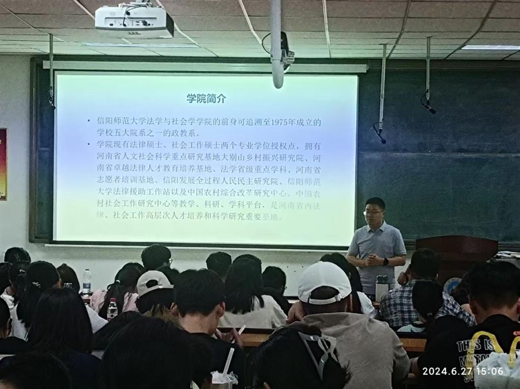 座谈会后,在河南城建学院法学院阶梯教室举行了研究生招生宣讲会,河南城建学院法学院2021级和2022级本科生共计100余人参加了宣讲会。朱茂磊就我院研究生招生专业、规模、课程设置、毕业要求、奖助体系、培养优势等向与会同学做了全面介绍。费泽丹就学校和学院在研究生学习期间的服务管理工作进行了说明。在校研究生代表罗世刚结合自身经历向与会同学提出了具体的报考和备考建议。宣讲会结束后,与会师生还围绕研究生报考院校选择、专业方向确定、专业课和公共课备考等进行了充分交流。