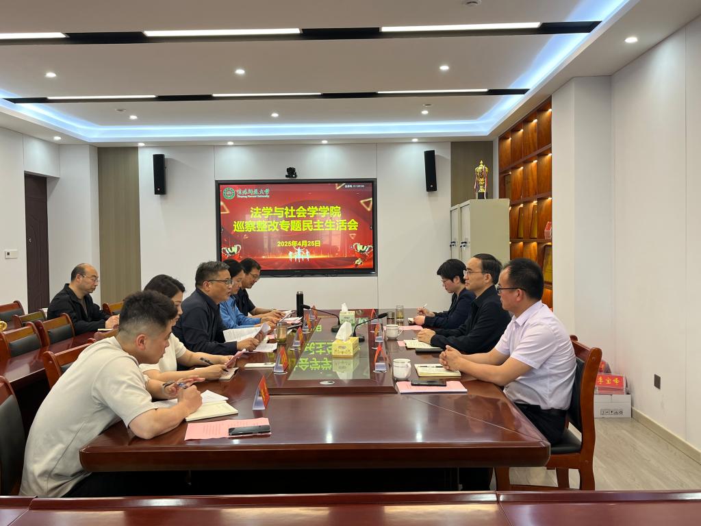 丁其科作指导讲话。他指出,民主生活会是党内政治生活的重要内容,是促进党委领导班子认识再提升、问题再聚焦、整改再加强、效果再提升的重要方式。此次会议,法学与社会学学院党委切实紧扣巡察反馈的问题,会前准备扎实充分,查摆问题深入细致,开展批评严肃认真,整改措施具体务实,开得比较成功,达到了预期效果。并就扎实做好巡察整改工作提出明确的要求,一是进一步深化理论学习,打牢思想基础;二是进一步严肃党内政治生活,净化政治生态;三是进一步抓好问题整改,解决突出问题;四是进一步扩大整改成效,推进事业发展,真正把巡察整改的成效转化为党委提高凝聚力、战斗力的成效,转化为促进党委领导班子成员及党员干部作风转变的成效,转化为推动学院整体工作高质量跨越式发展的成效。
