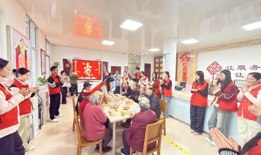 活动中,同学们向老人们表达了诚挚的敬意与祝福,依次表演了歌曲《我和我的祖国》、诗朗诵《中华少年》、小品《抬杠》、手势舞《桃花朵朵开》、助眠操和灵活手指操等精彩节目,现场气氛热烈,笑声掌声不断。生日会在欢声笑语中圆满落幕,老人们对同学们的表演连连称赞并表达谢意。最后,孔令媛和同学们为老人们切分蛋糕并戴上生日帽,全场齐唱生日歌,将温馨氛围推向高潮。