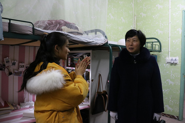 老师们分别查看了2018级和2017级学生宿舍。在每一个宿舍,樊书记,杨老师,王老师问候学生住宿状况,关切学生冬被及过冬衣物是否充裕。樊书记对大一新生给予深切关心,她指出同学们远离父母,独自在外过冬,要注重身体健康,遇到困难可以反馈给老师与学院,自己在外求学要让家中亲人放心。王老师嘱咐他们,临近期末考试认真学习的同时也要保重身体。老师们的话让学生们纷纷表示感受到了家的温馨,同学们脸上都洋溢着被关怀的幸福笑容。