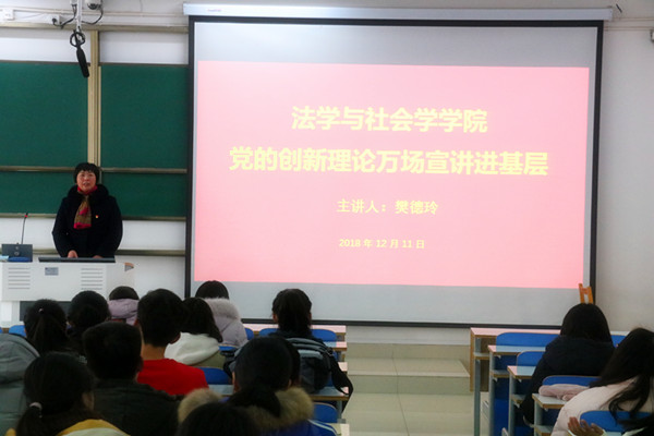 12月11日,tyc7111cc太阳成集团于社科楼517教室开展“党的创新理论万场宣讲进基层”讲座,党委副书记樊德玲担任主讲人,党委秘书王一帆和全院学生共同参与了此次讲座。