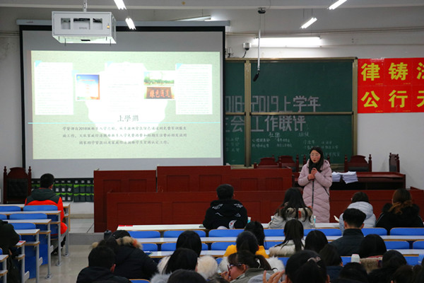 会议伊始,由杨胜利老师为本次会议致辞,他对我院学生会各部门的工作表达充分的肯定,教导全体学生会成员不忘初心,牢记自己当初加入学生会的初衷。杨老师寄语学生会全体成员,总结自己过去一年的工作经验,在新的一年里书写新的华章。随后,会议进入学生会各部门、社团和班级的工作总结,均采用成员演讲、PPT放映的形式向大家展示,内容涵盖了这半学期以来为学院所做的各方面工作,清晰地展示了我院学生会成员的辛勤日常。最后,学生会主席团轮流对本次会议作出总结,他们对学生会的工作予以肯定,也提出了不足之处,相信未来学生会将更加出色。