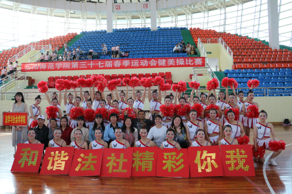 本次比赛共有预赛,决赛两个赛程,预赛时,同学们以精致的妆容、整齐的服装亮相,高难度的队形技巧,明快奔放的动作,鲜明的节奏感向大家展示了青春的激情, 展示了力与美的结合,赢得了在场观众的阵阵喝彩,队员们身着的红白相间的队服彰显法社学院的激情与奔放,演绎出法社学院的活力与坚强, 灿烂的笑容展现了我院学子昂扬向上的精神状态,征服全场观众。最终,我院以19.49的成绩在预赛中排名第四。 4月19日,运动会开幕式的健美操决赛中,我院健美操队员动作整齐划一,凭借优美和谐的形体姿态,律动鲜明的节奏美感夺得第三名的优异成绩。在健美操训练期间,我院领导老师高度重视本次比赛,党委书记王文华,院长李文发,副院长贾义保,张义明,党委副书记樊德玲等领导老师多次到达现场慰问健美操队员并给予鼓励。