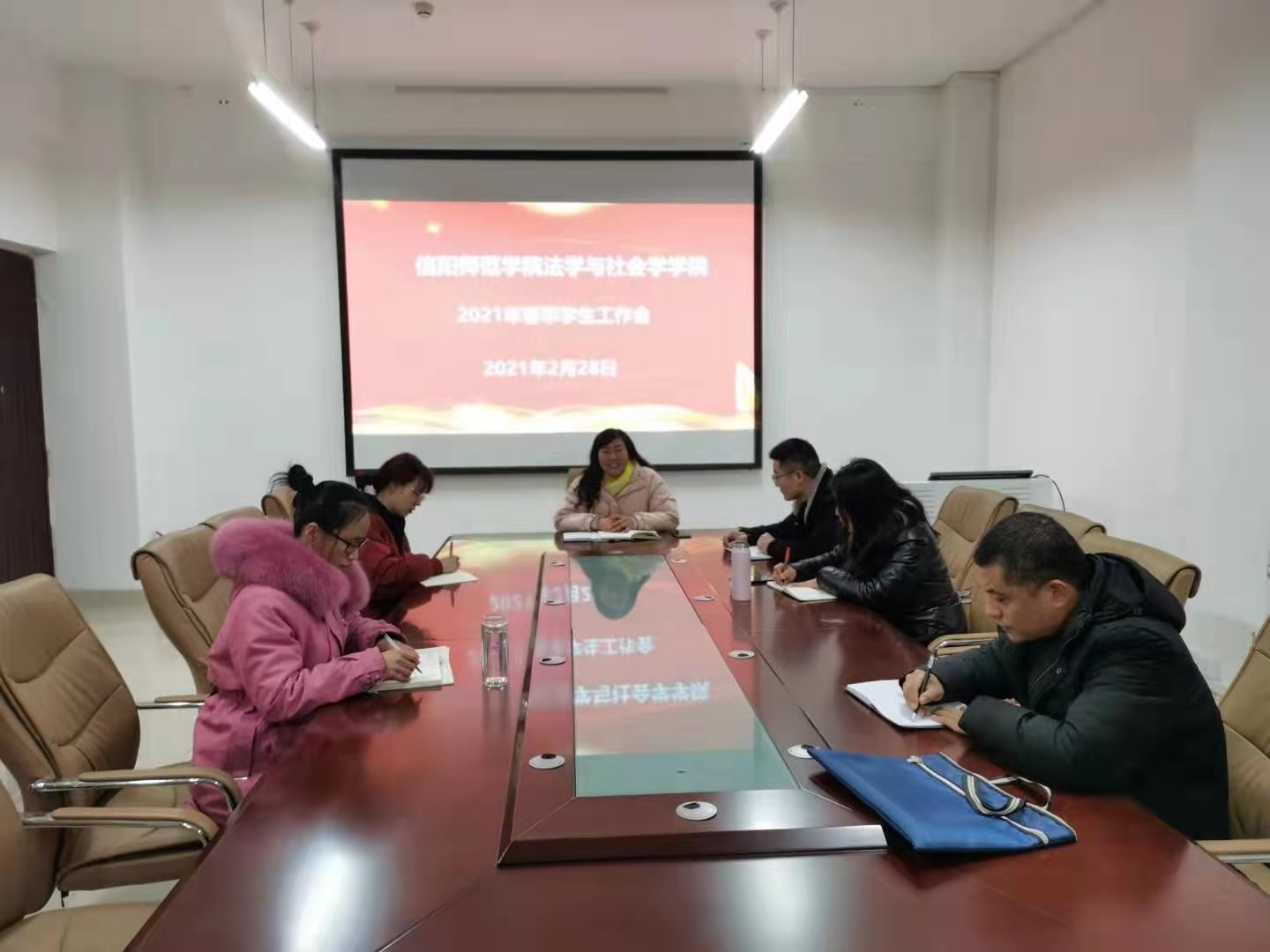 2月28号下午,tyc7111cc太阳成集团在社科楼412召开2021春季学生工作会。党委副书记樊德玲、团委书记袁艳红、正科级辅导员郭瑞、18级辅导员王艳丽、20级辅导员杨胜利、团委副书记王瑾出席此次会议。