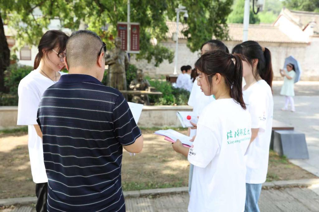 在何家冲政治文化广场,队员面向党旗,在李莉的领誓下,重温入党誓词,铿锵有力的誓言表达了队员们传承红色基因,弘扬爱国精神的信心和决心。在中国工农红军第二十五军军部旧址——何氏祠,队员们怀着崇敬的心情,学习红二十五军的光辉历史和革命精神。在银杏树下,李莉为队员介绍这棵银杏树,它是二十五军出发长征的见证和标志,被称为“绿色纪念塔”。最后,队员们对本地居民发放调查问卷,深入了解乡村振兴战略实施以来当地的基础设施、人居环境、家庭收入、精神文化生活等方面的情况。
