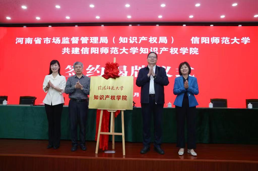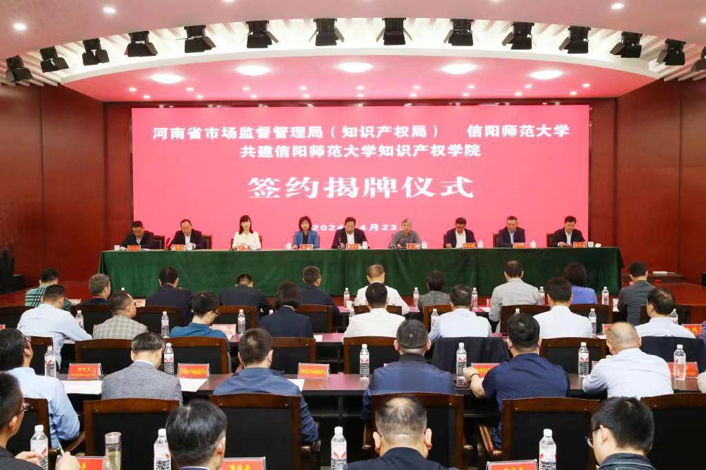 4月23日,河南省市场监督管理局(知识产权局)与太阳成tyc7111cc共建知识产权学院签约揭牌仪式暨“新时代知识产权学院建设与知识产权人才培养”座谈会在我校举行。河南省市场监督管理局党组成员、省知识产权局局长刘怀章,河南省知识产权维权保护中心副主任闻相俊,信阳市人民政府副市长郑云,校长李俊,副校长王娟、井强山、涂友超等出席仪式。省内7家高校知识产权学院、信阳市县两级市场监管系统代表,我校相关职能部门、tyc7111cc太阳成集团师生代表120余人参加活动。王娟主持仪式。