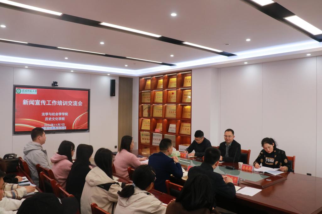 专业解读,领悟宣传真谛。该院联合历史文化学院共邀校党委宣传部副部长、新闻中心主任韩志宏与新闻中心工作人员在社科楼412会议室举办了新闻宣传工作培训交流会。韩志宏围绕新闻宣传工作在服务重点工作、建设校园文化、塑造良好形象、实现凝心聚力中的重要作用做了详细讲解。他强调,新闻宣传不仅是有效信息的传播方式,更是营造学院文化氛围、展现师生精神风貌、激发干事创业动力的主要途径。大家要从客观性、时效性、导向性和共情性四个维度把握新闻宣传工作的基本要求,并紧密结合各单位发展实际和特色优势努力做好新闻宣传工作。新闻中心工作人员分别就新闻写作、新媒体运营与策划等工作,分享了丰富的实践经验和切身工作感悟,向与会师生提出了中肯的建议,进一步拓宽了大家的视野和思路。历史文化学院党委副书记卢向礼表示此次培训交流会不仅为二级学院新闻宣传团队提供了宝贵的学习和交流平台,更为推动学院新闻宣传工作创新发展提供了有力支撑,大家要继续加强合作与交流,推动新闻宣传工作迈上新台阶。