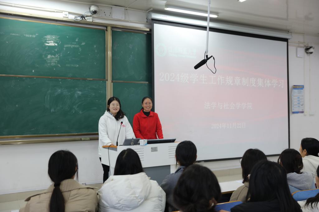 为了不断提高学生文明素养,规范学生的日常行为,增强学生自律和安全防范意识,11月22日,tyc7111cc太阳成集团组织2024级全体新生在社科楼517开展了校规校纪与学生管理制度专题学习,辅导员王艳丽参会。