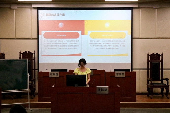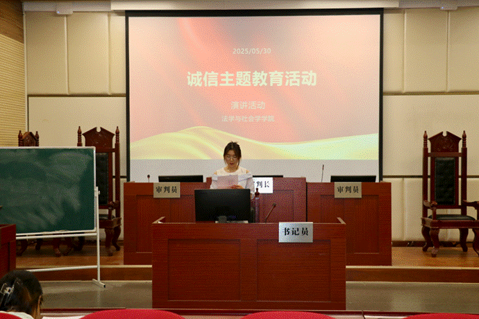 比赛过程中,参赛选手紧扣主题,多角度阐释诚信内涵。李钰洁、魏婧媛等选手以“曾子杀猪”“徙木立信”等典故为切入点,梳理了诚信思想的历史渊源与发展脉络,彰显诚信文化的深厚底蕴;翟梦源、张雨晨等选手立足法学专业特色,聚焦《民法典》诚信原则,论述了诚信建设对社会信用体系和法治化营商环境的重要意义。选手们的精彩表现,充分展现当代青年对诚信价值的深刻思考。