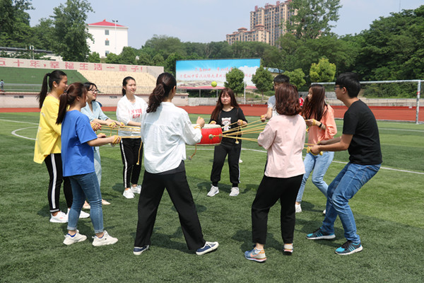 活动伊始,党委副书记樊德玲发表讲话。她讲到,此次户外素质拓展活动不仅仅是为了丰富学生的课余生活,增强学生与老师之间的沟通与交流,更是锻炼学生心理健康素质,促进大学生全面发展。本次拓展活动以游戏的模式展开,共设有十人九足、珠行万里、袋鼠跳、无敌风火轮以及雷霆战鼓五项比赛项目。在十人九足和珠行万里两个项目中,同学们配合默契,争分夺秒,努力赢得比赛。在接下来的袋鼠跳中,同学们穿上袋鼠服装,各班轮流跳跃比赛,幽默搞笑的动作引来陈阵欢笑。敌风火轮和雷霆战鼓两个项目充分考验了各班同学的团结协作精神,让同学们在游戏中感受到了集体的力量。活动结束后,全体同学与领导老师合影留念。