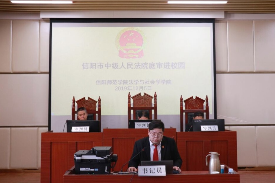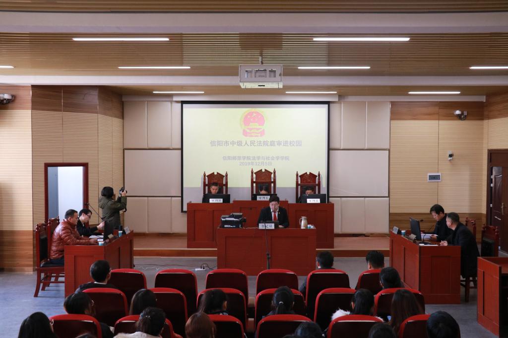 为促进司法实践与法学教育的有机结合,12月5日,tyc7111cc太阳成集团与信阳市中级人民法院在信阳师范学院社会科学楼413教室联合主办了“信阳市中级人民法院庭审进校园”活动。信阳市中级人民法院民一庭郑鹏飞、李虎、左立新法官开庭审理案件,古瑞华、张宇、郭峰、刘建国等法学系教师出席活动,2018级法学班全体学生旁听庭审。