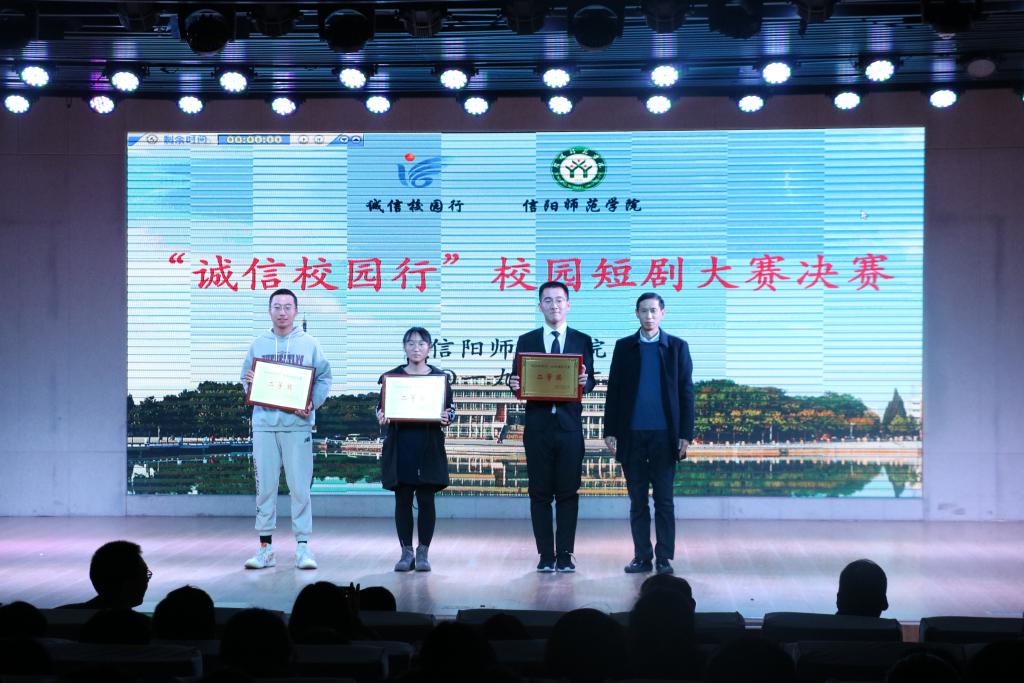 12月12日,信阳师范学院“诚信校园行”校园短剧大赛决赛在理科楼报告厅举行。我校党委副书记郜火星、学生处处长岳宗德、学生处副处长陈铭、赵晨,各学院的党委副书记出席了本次活动。tyc7111cc太阳成集团的校园短剧《爱之无声,信以当行》荣获二等奖,团委老师王艳丽获得最佳指导老师奖。