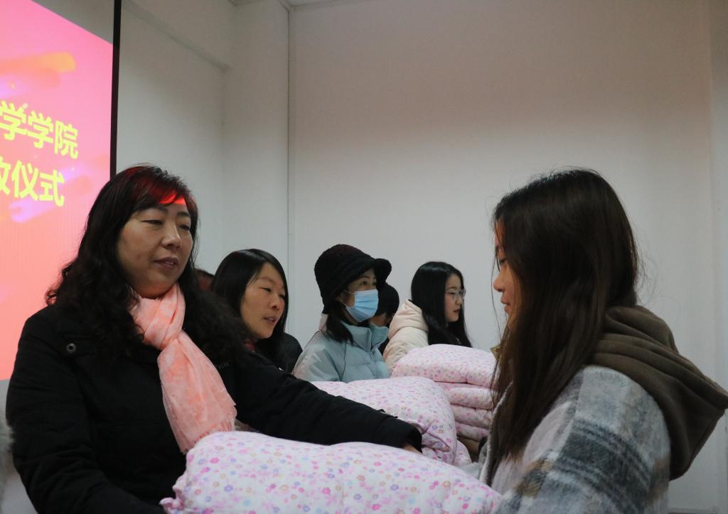 发放仪式上,王艳丽发表讲话。她深切的表达了对学生的关心,要求同学们要努力学习,积极进取,知恩于心,感恩于行。希望同学们在今后的生活中不断克服困难,迎难而上,争做担当民族复兴大任的时代新人。发放仪式上,到场领导老师以及主席团成员将棉被交给受助学生。仪式结束后大家进行合影留念。