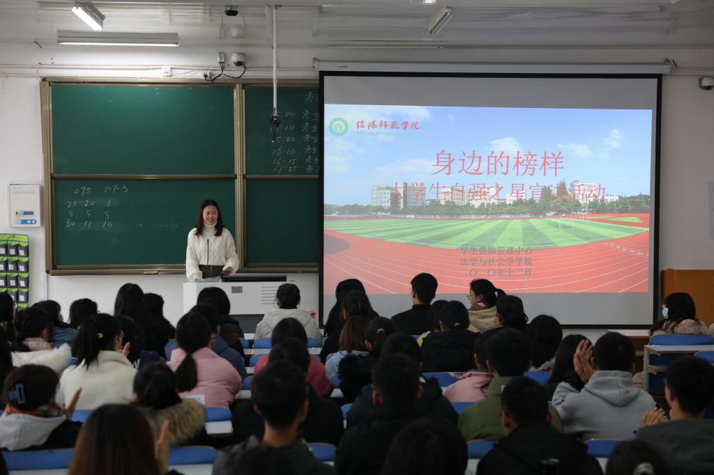 为了响应国家资助政策,弘扬自立自强精神,鼓励学生学习优秀典型,12月13日上午,学生资助管理中心于社科楼517教室举办“大学生自强之星”资助宣讲活动。本次活动由资助专员王艳丽主持。法学与社学学院19级、20级全体学生参加此次活动。