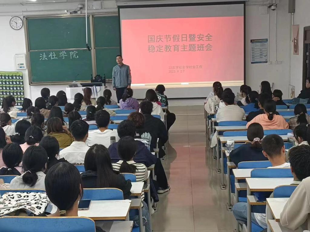 为了做好国庆假期学生安全工作,进一步增强学生自我保护意识,提高学生自我保护能力。我院于9月27日在社科楼517召开国庆节假日暨安全稳定教育主题班会。辅导员费泽丹、主席团全体成员、2023级全体学生参加会议。会议由学生会执行主席秦浩主持。