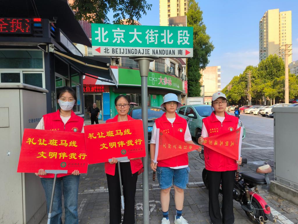 践行志愿精神,引领文明风尚。为营造“弘扬文明出行理念,共创安全有序交通”的文明交通氛围,弘扬“奉献、友爱、互助、进步”社会志愿精神,辅导员王艳丽、费泽丹带领学生冒着酷暑在市区重要路口开展文明交通劝导志愿服务活动,大大提高了学生们参与社会服务的责任感。