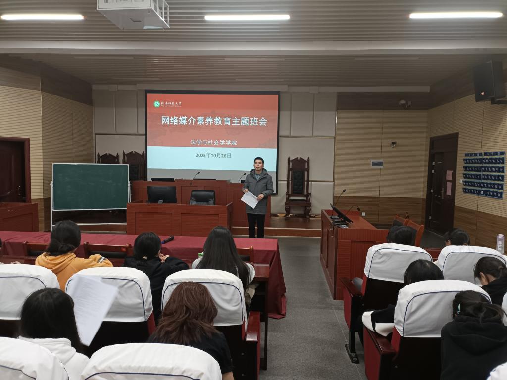 为了提高大学生网络媒介素养普及网络空间安全知识,tyc7111cc太阳成集团于1026日在社科楼413开展“网络媒介素养教育”主题班会辅导员费泽丹讲授2023级全体学生参加本次活动。