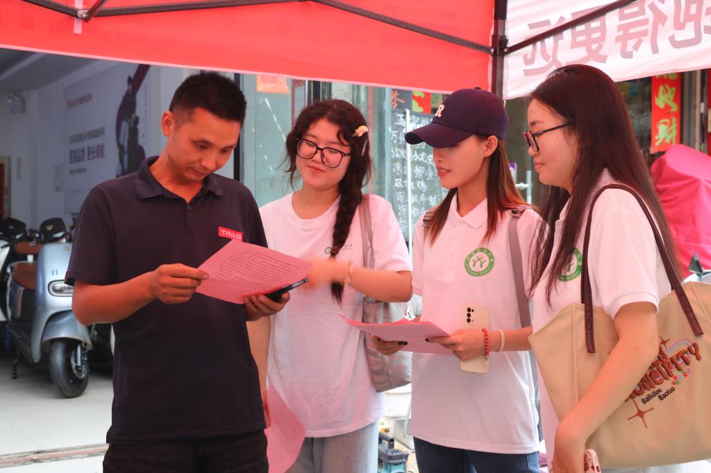 在飨堂社区,实践团成员们带着二十大报告、《民法典》、防溺水、防诈骗宣传册,走访当地商户和居民。队员们向居民分发党的二十大报告宣传册并主动讲解,帮助居民认真学习习近平新时代中国特色社会主义思想,同时,队员们为居民发放《民法典》宣传册,向居民讲解了《民法典》中的法律知识,最后,队员们向居民们讲解了防溺水和防诈骗的重要性,提高了居民们的防范意识。