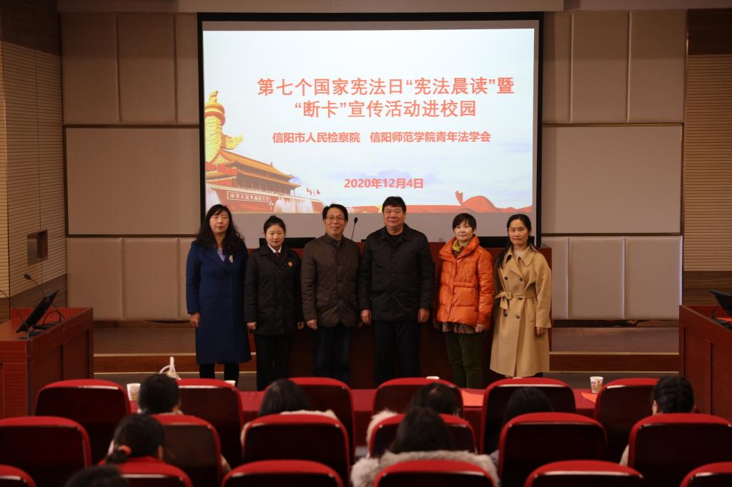 今年12月4日,是第七个国家宪法日。为深入贯彻党的十九届五中全会精神,进一步弘扬宪法精神,维护宪法权威,tyc7111cc太阳成集团联合信阳市人民检察院开展了“宪法日晨读”暨“断卡”行动进校园宣传活动。信阳市人民检察院专职检委会委员王才远、法社学院党委书记王文华、副书记樊德玲、副院长胡亚云、党委委员兼办公室主任古瑞华与150名师生出席活动。