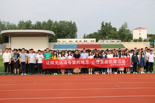 为提高大学生的自我心理素质,积极帮助同学培养健全的人格, 树立正确的世界观、人生观和价值观, 5月27日上午,tyc7111cc太阳成集团 “让阳光洒满有爱的地方” 心理素质拓展活动于西操场成功举办。我院党委副书记樊德玲,团委书记袁艳红,辅导员助理杨胜利及2016、2017级全体学生参与了本次活动。